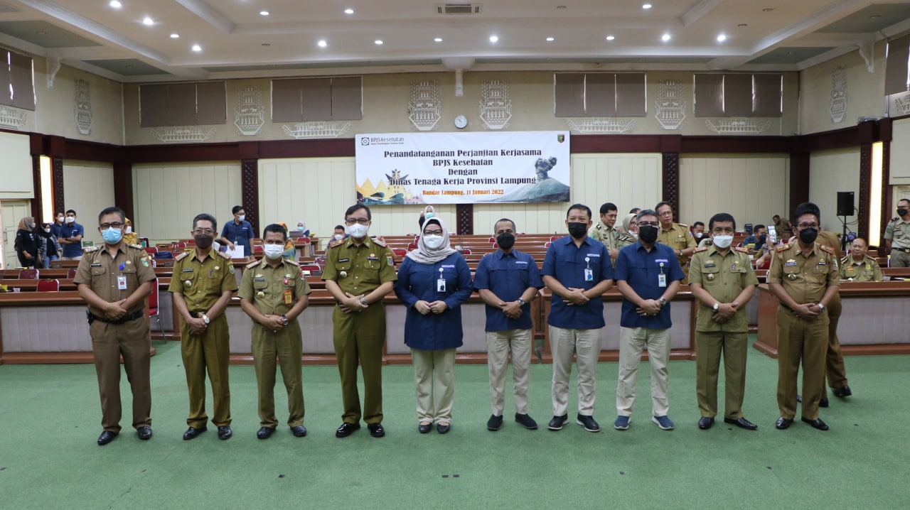Bandar Lampung, – Dalam rangka meningkatkan cakupan kepesertaan dan kepatuhan dalam pelaksanaan program Jaminan Kesehatan Nasional, BPJS Kesehatan Kedeputian Wilayah Banten Kalimantan Barat dan Lampung menggelar kegiatan penandatanganan perjanjian kerjasama bersama Dinas Tenaga Kerja Provinsi Lampung dan Dinas Tenaga Kerja Kota Bandar Lampung, Kabupaten Lampung Selatan, Pesawaran, Prigsewu, Tanggamus, Lampung Utara, Way Kanan, Lampung Barat dan Pesisir Barat tentang sinergi perluasan kepesertaan dan peningkatan kepatuhan dalam penyelenggaraan Program JKN-KIS secara ofline dan online di Gedung Pusiban Kantor Pemerintah Provinsi Lampung (11/01).