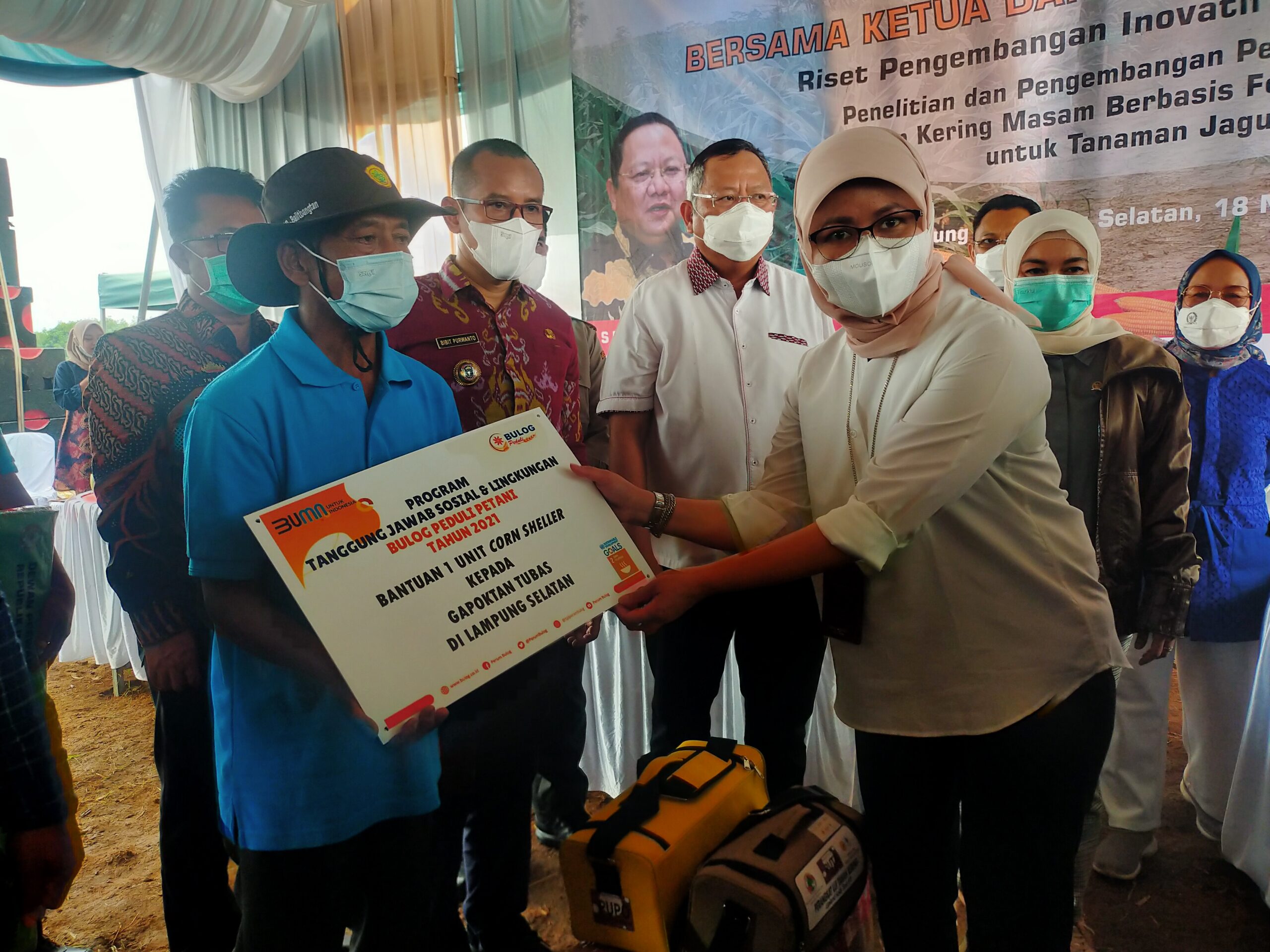 LAMPUNGSELATAN — Direktur Bisnis Perum Bulog Febby Novita, didampingi Kepala Bulog Lampung Eti Yulianti, secara langsung menyerahkan bantuan berupa dua unit mesin pengupas jagung, untuk petani di Desa Karang Rejo, Kec. Jati Agung, Kab. Lampung Selatan, Lampung, Kamis (18/11/2021).