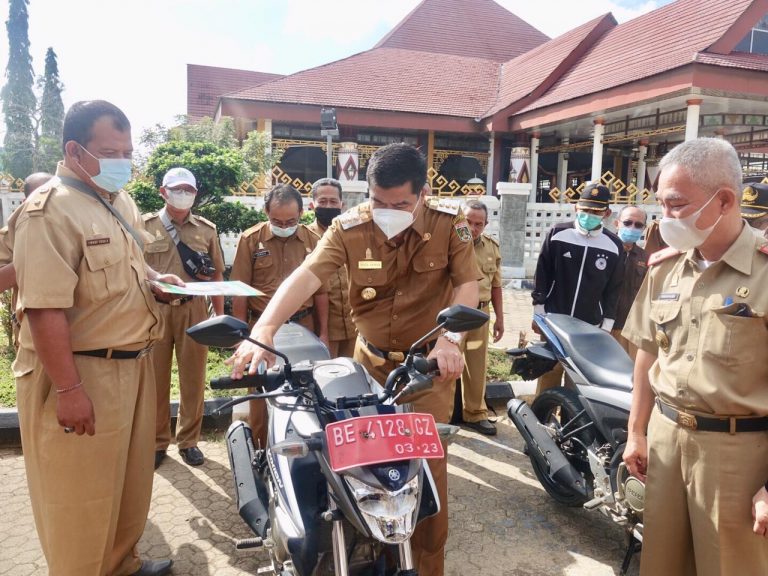 Lampung Tengah – Bupati Lampung Tengah Musa Ahmad membagikan secara simbolis kendaraan dinas roda dua kepada petugas di Lingkungan Dinas Pertanian Kab Lampung Tengah yang bertempat di Rumah dinas Bupati Selasa 4 Mei 2021 .