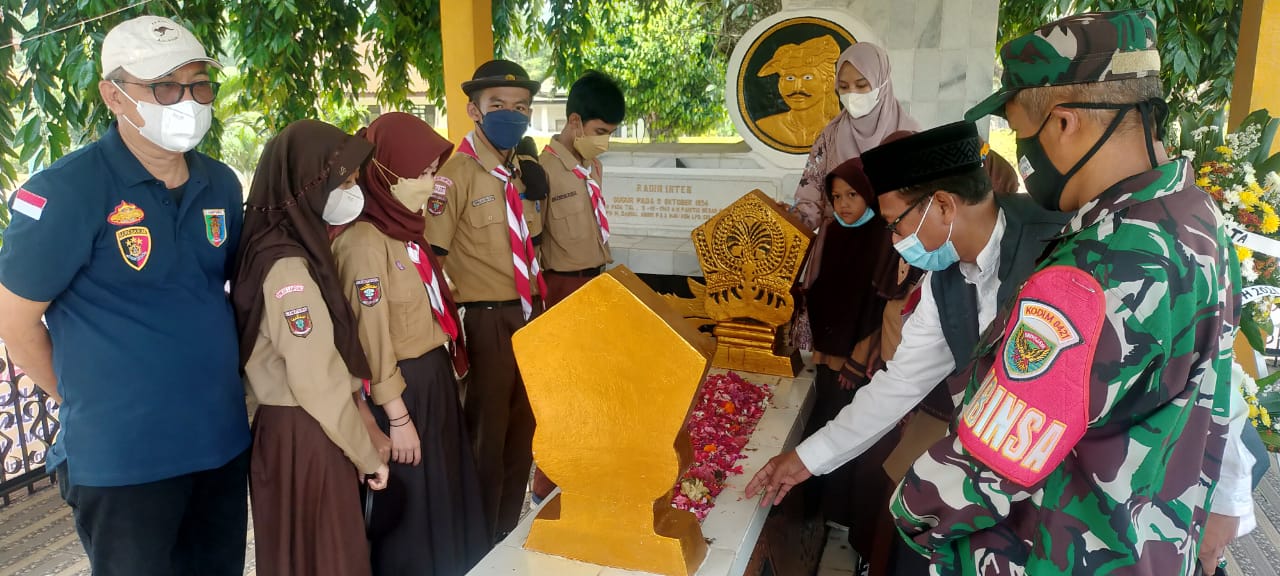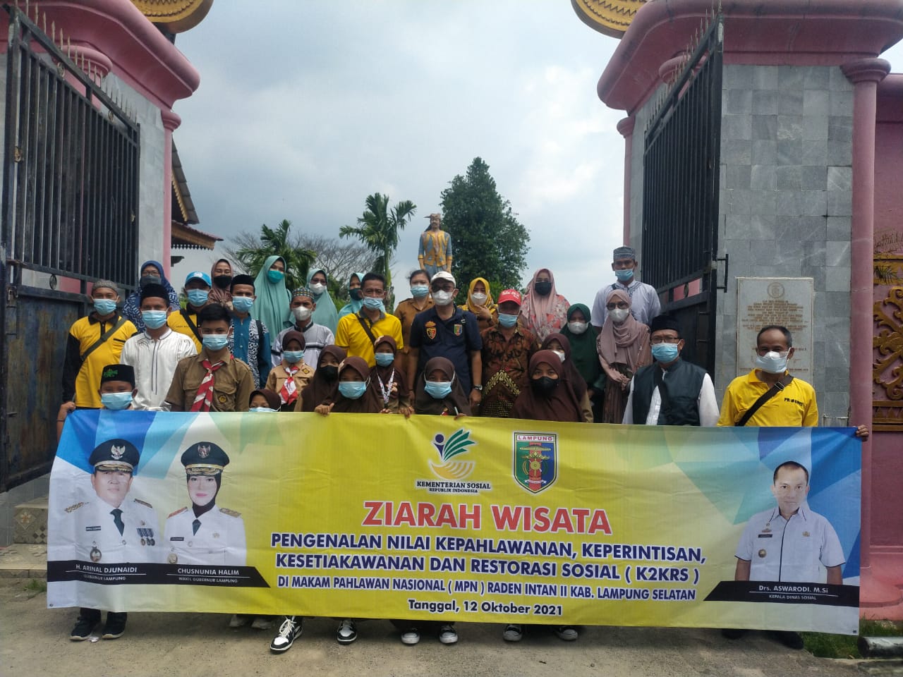 LAMPUNGSELATAN — Guna menanamkan nilai-nilai kepahlawanan kepada para generasi muda, Dinas Sosial provinsi Lampung mengajak siswa SMP, MTS MI dan SD di Kota Bandar Lampung untuk mengikuti ziarah wisata di makam Raden Intan II, di Desa Gedung Harta, Penengahan Lampung Selatan, Selasa, 12 Oktober 2021.