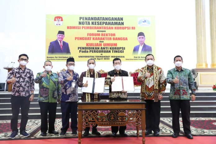 Penandatanganan dilakukan Ketua FRPKB Prof. Dr. Karomani, M.Si., yang juga rektor Universitas Lampung (UNILA)bersama Ketua KPK RI Komisaris Jendral Polisi Firli Bahuri, M.Si., di Gelanggang Mahasiswa Dr. Nasrullah Yusuf Universitas Teknokrat Indonesia (UTI), Senin, 25 April 2022.