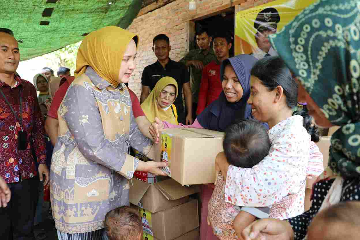 LAMPUNG TENGAH —- Ketua Tim Penggerak PKK Provinsi Lampung Ibu Riana Sari Arinal membagikan paket bantuan sembako penanganan stunting kepada Ibu Hamil dan Ibu yang memiliki Balita di Kelurahan Simbarwaringin, Kecamatan Trimurjo, Kabupaten Lampung Tengah, Jum’at (15/12/2023).
