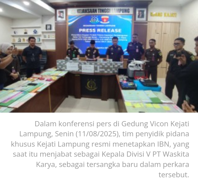 Dalam konferensi pers di Gedung Vicon Kejati Lampung, Senin (11/08/2025), tim penyidik pidana khusus Kejati Lampung resmi menetapkan IBN, yang saat itu menjabat sebagai Kepala Divisi V PT Waskita Karya, sebagai tersangka baru dalam perkara tersebut.