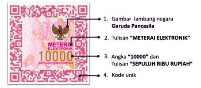 Meterai elektronik sendiri memiliki kode unik berupa nomor seri dan keterangan tertentu yang terdiri atas gambar lambang negara Garuda Pancasila, tulisan “METERAI ELEKTRONIK”, serta angka dan tulisan yang menunjukkan tarif bea meterai.