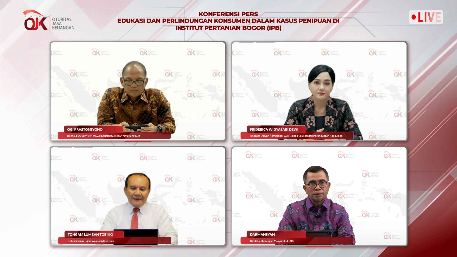 Jakarta, 19 Desember 2022. Otoritas Jasa Keuangan (OJK) menyampaikan bahwa para mahasiswa Institut Pertanian Bogor (IPB) yang menjadi korban penipuan berkedok kerja sama penjualan online telah berhasil mendapat keringanan atau restrukturisasi pinjaman dari empat platform penyedia pinjaman dana yang digunakan saat kejadian.