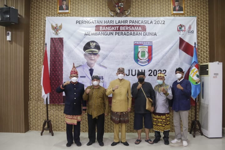 PRINGSEWU – Penjabat Bupati Pringsewu Adi Erlansyah mengikuti upacara peringatan Hari Lahir Pancasila Tahun 2022 secara virtual. Penjabat Bupati didampingi sejumlah pejabat pemerintah daerah mengikuti upacara dari Ruang Teleconference Kantor Pemkab Pringsewu, Rabu (01/06/22) pagi, dengan mengenakan pakaian adat Lampung, serta beberapa pejabat mengenakan pakaian adat daerah lain seperti Jawa, Banten dan lainnya.