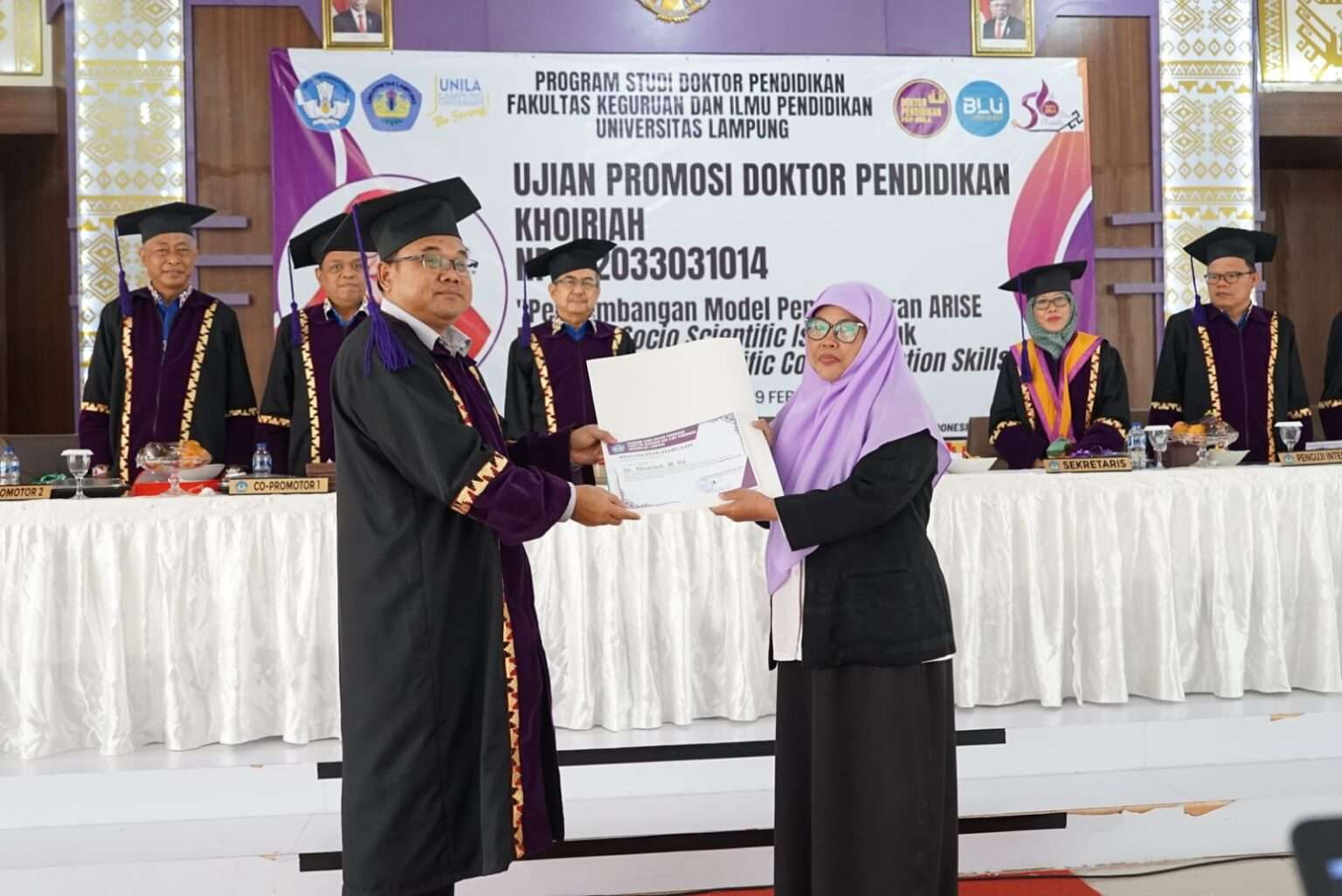 Promovendus Khoiriah dinyatakan lulus dan berhak menyandang gelar doktor setelah mempresentasikan disertasinya berjudul “Pengembangan Model Pembelajaran ARISE Berbasis Socio Scientific Issue untuk Menstimulasi Scientific Communication Skills”.