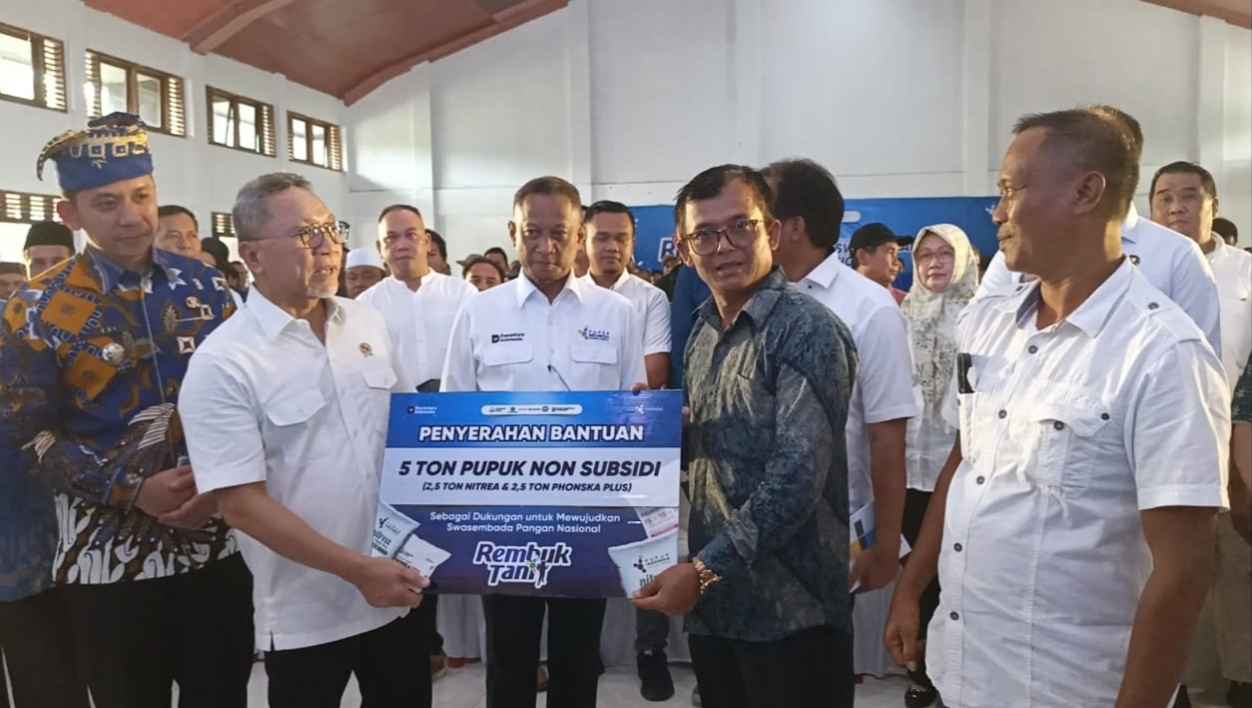 Pupuk diserahkan secara simbolis oleh Menteri Koordinator Bidang Pangan Zulkifli Hasan di Sekolah Kebangsaan Kalianda, Jumat 14 November 2025.