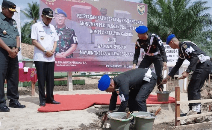 PANGGUNGREJO – Pusat Polisi Militer TNI-AD (Puspomad) membangun Monumen Perjuangan Prajurit CPM Kompi C Batalyon Garuda di Kabupaten Pringsewu. Peletakan batu pertama tanda dimulainya pembangunan monumen tersebut dilakukan oleh Wakil Komandan Pusat Polisi Militer TNI-AD (Wadanpuspomad) Mayjen TNI Eka Wijaya Permana di Pekon Panggungrejo, Kecamatan Sukoharjo, Pringsewu, Kamis (11/1/2024).