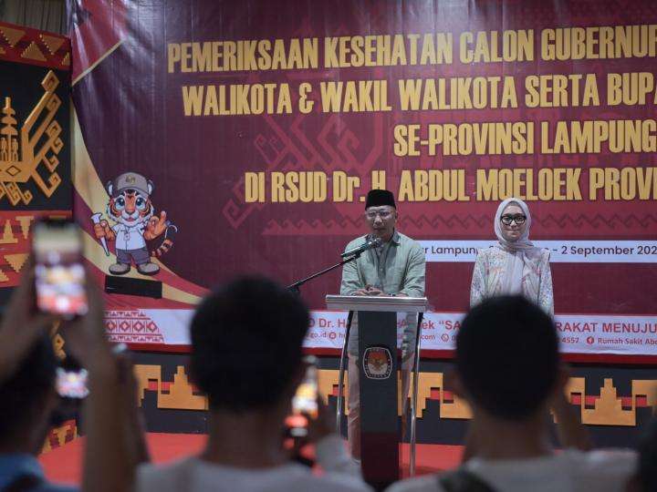 – Pasangan Calon Gubernur dan Wakil Gubernur Lampung, Rahmat Mirzani Djausal dan dr. Jihan Nurlela, mengikuti serangkaian pemeriksaan kesehatan jasmani di RSUD Dr. H. Abdul Moeloek, Minggu 1 September 2024, pukul 08.00 hingga pukul 19.30 WIB.