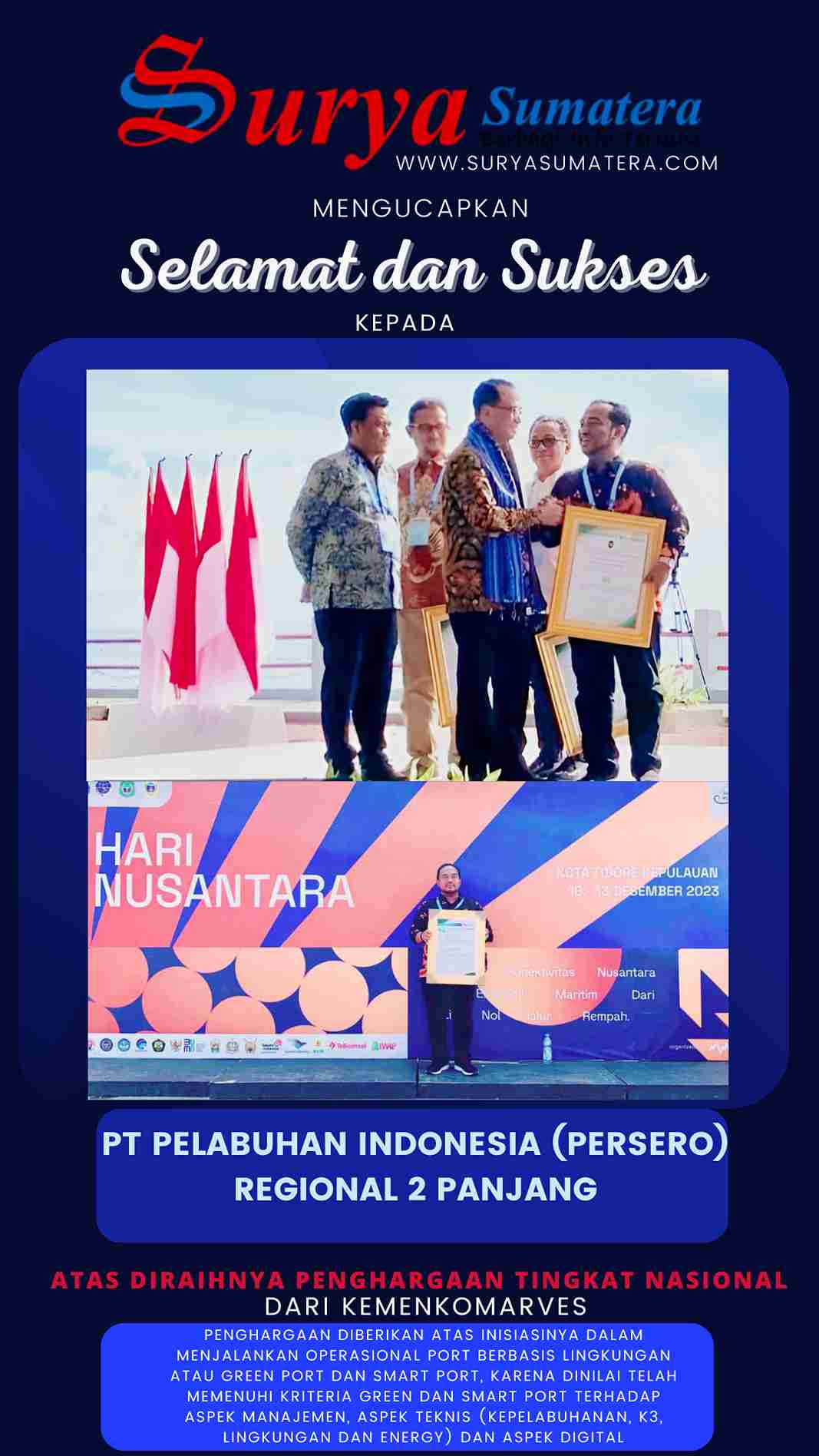 Segenap Jajaran Manajemen dan Redaksi Media Online Surya Sumatera mengucapkan “Selamat dan Sukses” Kepada PT Pelabuhan Indonesia (Persero) Regional 2 Panjang, atas diraihnya Penghargaan Tingkat Nasional dari Kementerian Koordinator Bidang Kemaritiman dan Investasi Republik Indonesia (KEMENKOMARVES)