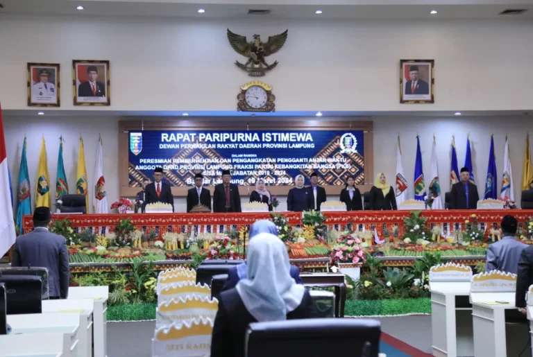 Bandar Lampung – Penjabat (Pj) Gubernur Lampung Samsudin menghadiri Rapat Paripurna Istimewa Dewan Perwakilan Rakyat Daerah (DPRD) Provinsi Lampung dalam rangka Pemberhentian Anggota DPRD Provinsi Lampung Masa Jabatan 2019 – 2024 dan pengucapan Sumpah Janji Anggota DPRD Provinsi Lampung Masa Jabatan 2024-2029, di Ruang Sidang Utama DPRD Provinsi Lampung, Senin (02/09/2024).