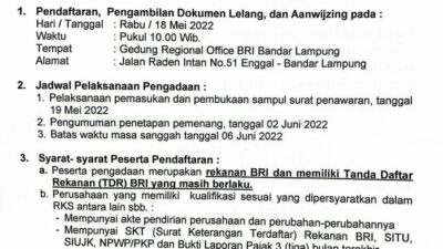 BANDARLAMPUNG — Dalam rangka rencana Pekerjaan Pembangunan Gedung Kantor BRI Unit Bantul Kanca BRI Metro Regional Office Bandar…
