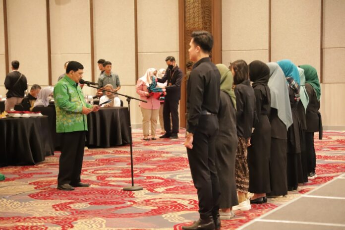 (Unila): Wakil Rektor Bidang Kemahasiswaan dan Alumni Universitas Lampung (Unila) Prof. Dr. Yulianto, M.S., melantik pengurus Satuan Tugas (Satgas) Pencegahan dan Penanganan Kekerasan Seksual (PPKS), di Ballroom Hotel Radisson, Senin, 9 Januari 2023.
